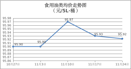 食用油类商品价格稳中微降。所监测的9种食用油(5L装)商品价格波动情况为2跌7平,综合零售均价为每桶95.92元,环比下降0.01%。其中:金龙鱼花生油、金龙鱼调和油零售均价为每桶102.67元、71.21元,环比分别下降0.03%、持平。