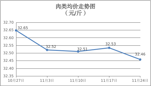 肉类商品价格微幅盘降。所监测的8种肉类商品价格波动情况为1涨5跌2平,综合零售均价为每斤32.46元,环比下降0.23%。其中:排骨、精瘦肉、牛肉、带骨羊肉零售均价分别为每斤32.10元、20.05元、45.80元、41.67元,环比分别下降0.77%、持平、下降0.17%、下降0.36%。