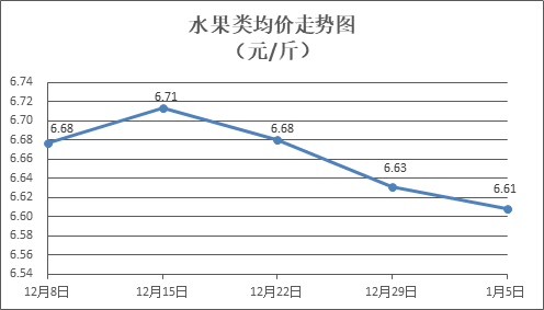 水果类商品价格小幅下降。所监测的6种水果商品价格波动情况为2涨4跌,综合零售均价为每斤6.61元,环比下降0.35%。其中橙子、苹果、葡萄零售均价分别为每斤5.79元、7.27元、13.93元,环比分别下降0.86%、下降1.22%、上涨0.29%。