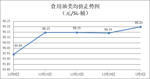 食用油类商品价格稳中略涨。所监测的9种食用油(5L装)商品价格波动情况为4涨5平,综合零售均价为每桶96.20元,环比上涨0.06%。其中:金龙鱼花生油、金龙鱼调和油零售均价为每桶103.14元、71.68元,环比分别持平、上涨0.15%。
