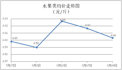 水果类商品价格涨少跌多。所监测的6种水果商品价格波动情况为2涨3跌1平,综合零售均价为每斤6.60元,环比下降0.20%。其中橙子、香蕉、葡萄零售均价分别为每斤7.01元、3.20元、13.34元,环比分别上涨2.19%、下降1.54%、下降1.48%。