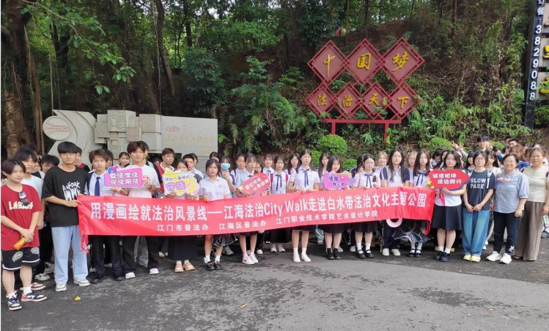 接下来,一行人来到首批省级法治文化主题公园、江门市首个法治主题公园——白水带法治文化主题公园。学生们沿着公园的主干道,从环山路到嬉水区,行走在公园的“法治常识线”上,走进一个个法治文化观赏区,学习法治历史、法治思想、法治常识等内容,用心感受法治文化主题公园“法融于景”的设计理念。
