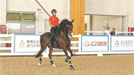 11月12日上午,十五运会马术盛装舞步个人决赛在深圳光明国际马术中心进行,今年47岁的江门籍运动员黄焯钦与合作5年的“战马”卡斯坦完成了一套优雅的盛装舞步动作,为自己第八次全运会征程画上了句号。
