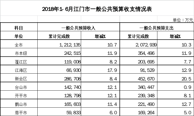 1-6月,全市一般公共预算收入完成1,212,135万元,同比增长10.7%。其中税收收入完成855,849万元,同比增长13.1%。全市一般公共预算支出完成2,072,939万元,同比增长10.3%。