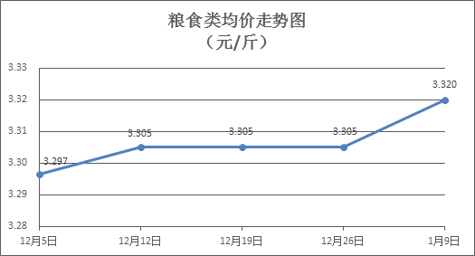 粮食类商品价格稳中微涨。本周所监测的6种粮食商品价格均持平,综合零售均价为3.320元/斤,环比上涨0.45%。其中:晚籼米、丝苗米、富强粉零售均价分别为每斤3.31元、3.52元、3.42元,环比分别为持平、下降0.28%、上涨1.18%。