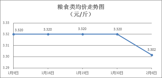 粮食类商品价格稳中略降。本周所监测的6种粮食商品价格波动情况为2涨4跌,综合零售均价为3.302元/斤,环比下降0.55%。其中:晚籼米、丝苗米、标准粉零售均价分别为每斤3.32元、3.45元、3.12元,环比分别上涨0.30%、下降1.99%、下降0.95%。