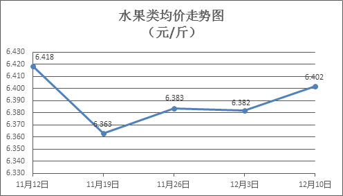 水果类商品价格总体略涨。上周所监测的6种水果商品价格波动情况为4涨2跌,综合零售均价为6.402元/斤,环比上涨0.31%。其中苹果、香蕉、葡萄零售均价分别为每斤7.34元、2.98元、13.03元,环比分别上涨0.41%、下降0.67%、上涨1.01%。