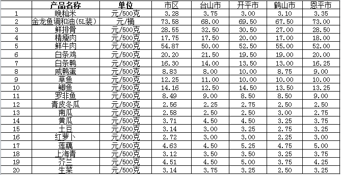 说明:1、表中价格为该地区监测点综合平均价;2、“市区”含蓬江区、江海区、新会区,价格分别采自蓬江市场、江南市场、城东市场等13家农贸市场;3、其他四个县市价格分别采自新华市场、锦江市场等8家农贸市场。