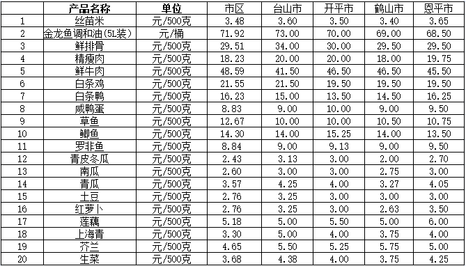 说明:1、表中价格为该地区监测点上周综合平均价;2、“市区”含蓬江区、江海区、新会区,价格分别采自蓬江市场、江南市场、城东市场等13家农贸市场;3、其他四个县市价格分别采自新华市场、锦江市场等8家农贸市场。