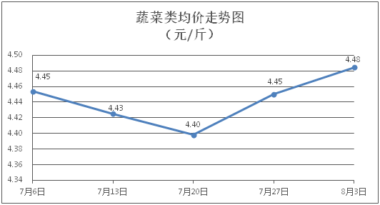 蔬菜类商品价格以涨为主。所监测的32 种蔬菜商品价格波动情况为20涨9跌3平,综合零售均价为每斤4.48元,环比上涨0.77%。其中:涨幅居前的品种包括丝瓜、韭菜、上海青,零售均价分别为每斤4.83元、4.79元、3.81元,环比分别上涨5.46%、4.13%、3.53%;跌幅靠前的品种包括生菜、红萝卜、菠菜,零售均价分别为每斤3.92元、2.95元、6.00元,环比分别下降1.75%、1.67%、1.48%。