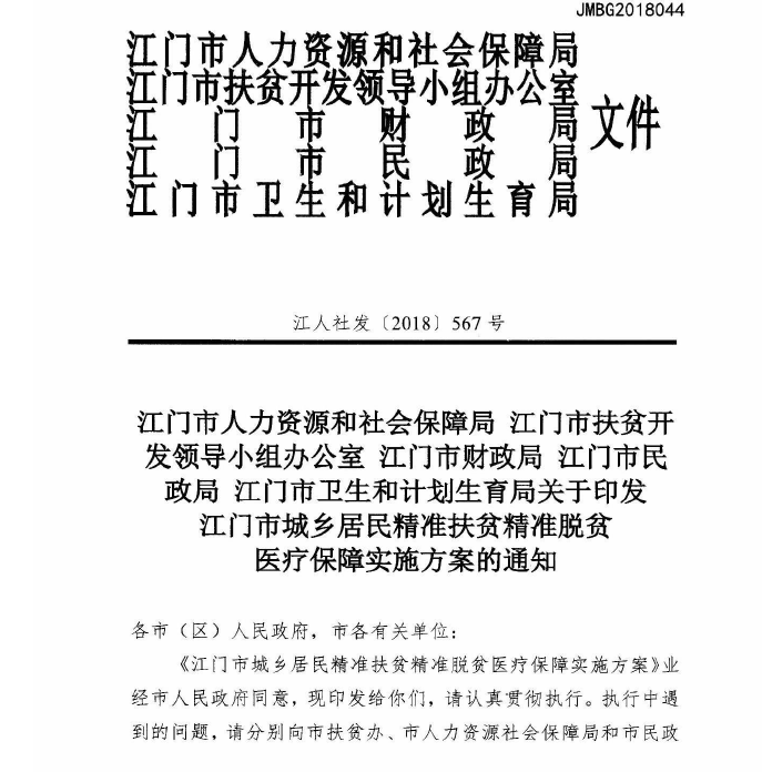江门市人力资源和社会保障局 江门市扶贫开发领导小组办公室 江门市财政局 江门市民政局 江门市卫生和计划生育局关于印发江门市城乡居民精准扶贫精准脱贫医疗保障实施方案的通知【已废止】