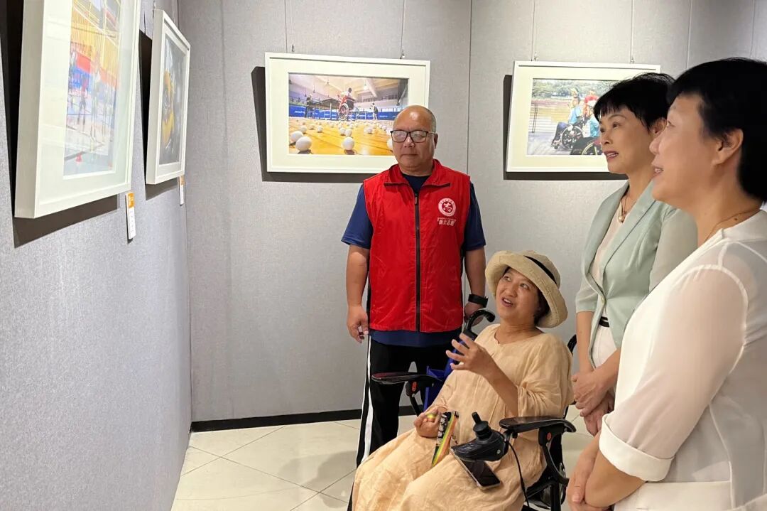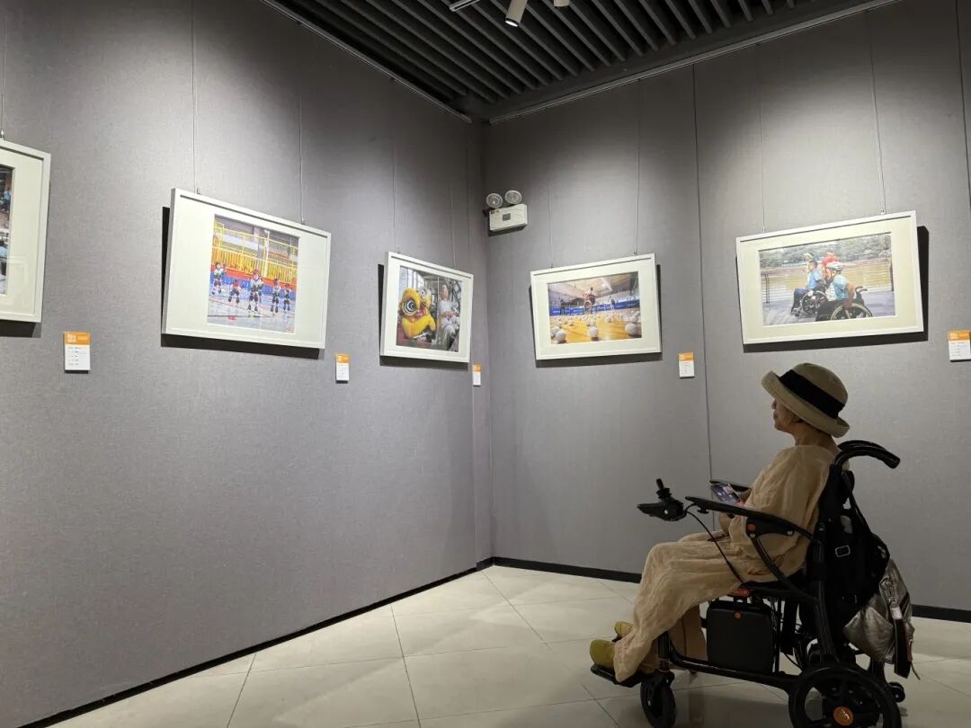开幕式当天,展厅内人流如织。来自蓬江区的教师李女士在一幅名为《轮椅上的晴空击球》的油画前驻足良久。画作定格了轮椅运动员挥拍扣杀的刹那——她身体后仰,手臂高扬,蓄势待发,奋力拼搏的姿态迸发出强大的生命力。“完全被震撼了,”李女士说道,“作者以鲜明的红色基调象征蓬勃的生命力,红白对比的构图将视线聚焦于主角。这些作品让人感受到的并非残缺,而是生命无限的可能。”
