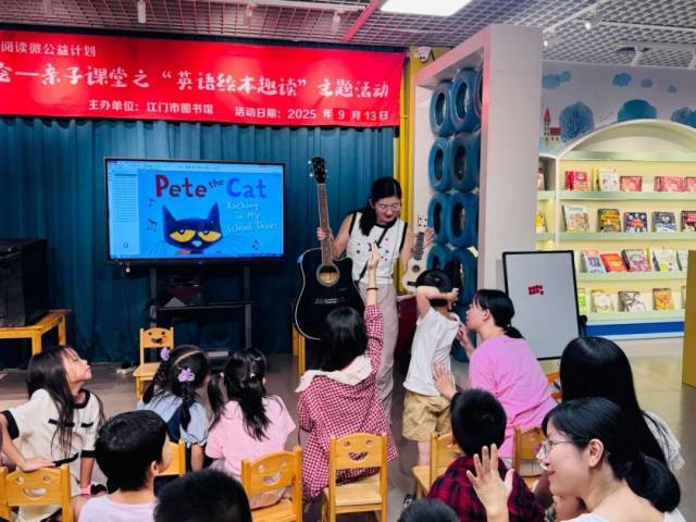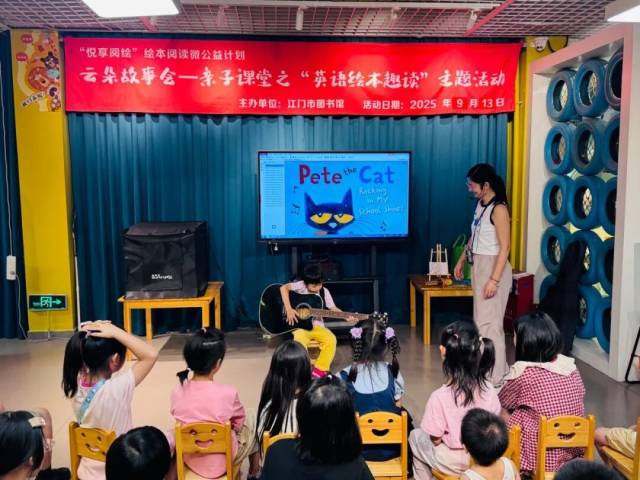 活动现场还巧妙穿插了尤克里里和吉他两种乐器。志愿者老师邀请小朋友们上台亲身体验,孩子们小心翼翼地触摸乐器,感受它们大小和重量的不同:尤克里里小巧轻便,孩子们单手就能轻松拿起;吉他则相对大一些、重一些,需要双手才能稳稳抱住。