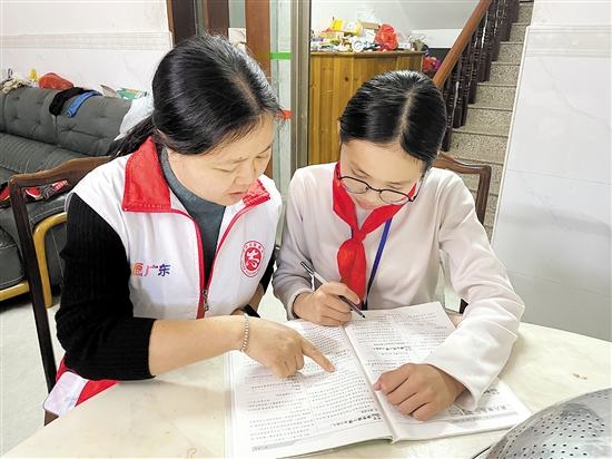 今年12岁的小雯是委内瑞拉籍,父母在美国谋生。她从小和姐姐一起,由奶奶抚养长大,现在和伯父伯母在恩平生活,日常只能通过网络视频和父母交流,日常学习辅导则由伯母负责。这让即将迈入青春期的小雯性格变得内向。今年9月,郑翠芳成为小雯的班主任,更成了她的“党员妈妈”。接到任务后,郑翠芳立即和小雯的爸爸以及伯母交流,了解小雯的情况,并慢慢与小雯熟悉起来。“小雯的家人对她都非常关心,即使有时差,我都坚持和她的父母沟通。小雯品学兼优,是我们班的副班长,她听话、文静,但习惯性地把自己的想法藏在心里,我们要及时进行了解、疏导。”