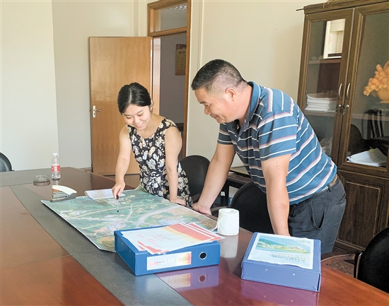 迳口村选调生崔雨萌(左)与村干部探讨项目情况。