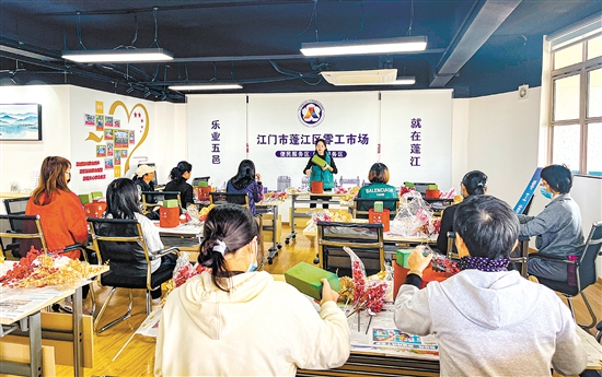 蓬江区零工市场为求职者提供“一站式”服务。图为群众参加新春福桶摆件制作培训。
