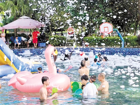 7月初,古兜阳光沙滩水乐园就启动了“冰爽夏日·快乐鸭”活动。到了周末,泼水对对碰、加特林水枪激情狂欢、水上蹦迪等精彩互动节目轮番上演,“点燃”现场欢乐氛围。