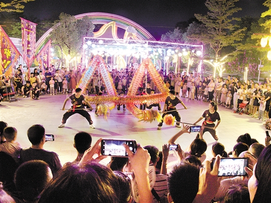 月影轻拂,龙腾盛世,9月16日晚,江海区白水带缤纷乐园“梦”主题游乐区人声鼎沸,一条“光龙”在月光下舞动龙身,配合绚烂的灯光和烟花,呈现出炫丽的视觉效果,不少家长带着小朋友追着“光龙”奔跑,十分欢快。