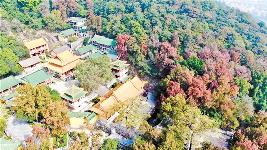 近期天气寒冷,圭峰山红叶迎来了观赏的好时机。从永镇山门沿着登山古道拾级而上,能够看见沿途的枫树叶已经变红。红叶美景在玉台寺周边最为集中,层林尽染,目光所到之处,尽是醉人的景色。棕红的枫叶与周边的绿松互相衬托,掩映之下的古刹玉台寺别具风韵。