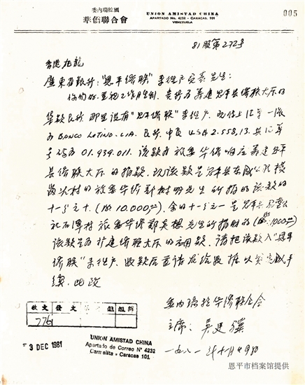 有一封来自当时的委内瑞拉华侨联合会主席吴建骥的信件清晰记载了海外侨胞筹款支持恩平侨联大厦建设的善举,汇入美元逾2500元。还有一封同样来自委内瑞拉的信件,记载郑铭树、郑锦华、郑树明等3人的捐款情况,共向账户汇入善款2万美元,其中一部分款项用于建设东成镇横岗头学校。