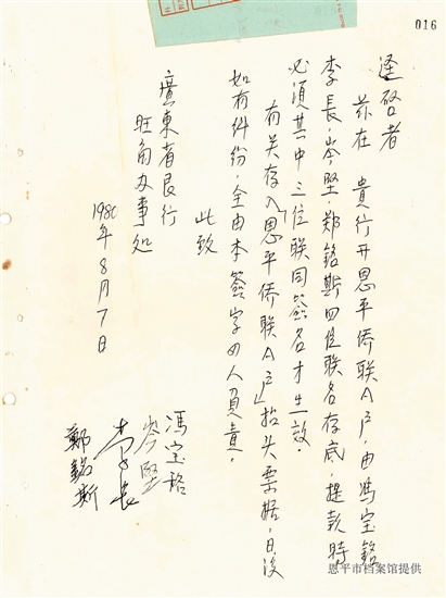 为了筹集资金,冯宝铭、李长、岑坚、郑铭斯等人在广东省银行香港分行开了联名合伙账户“恩平侨联(A)”,账号由4人联名存底,并规定“提款时必须由其中3位联同签名才生效,有关存入‘恩平侨联(A)’户抬头票据,日后如有纠纷,全由本签字4人负责”,文后附有4人的签名。