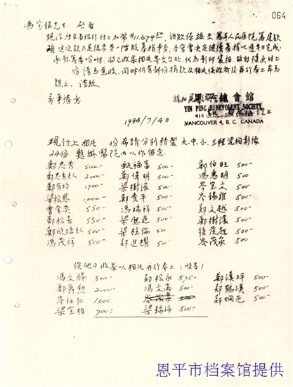 旅加侨胞捐资兴建恩平人民医院的相关信件。