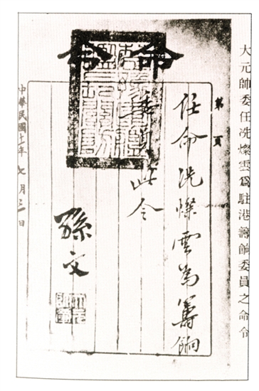 民国十一年,孙中山给冼灿云的委任状。