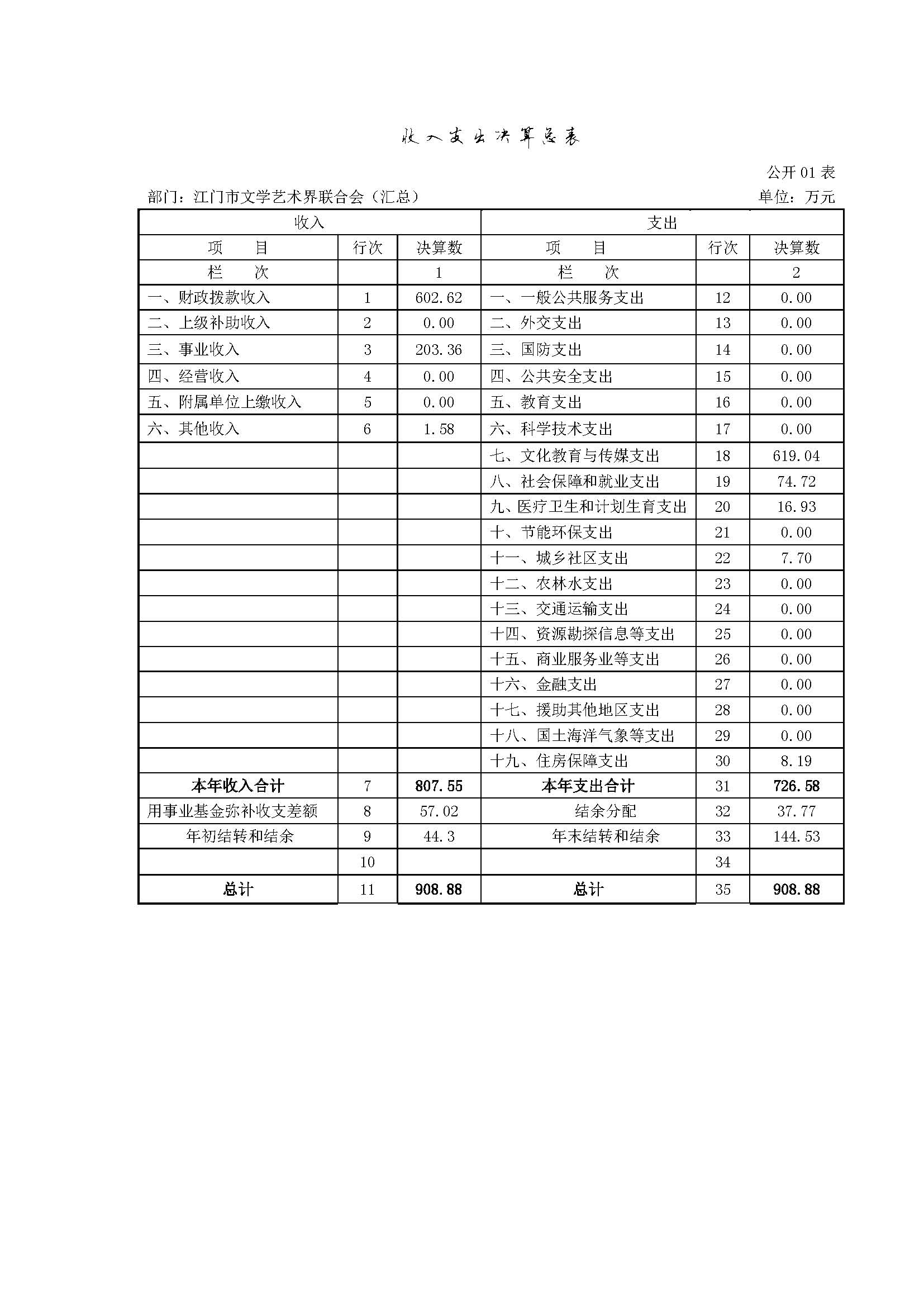 江门市文学艺术界联合会(以下简称“文联”)2015年度总收入908.88万元,其中本年收入 807.55 万元。具体情况如下: