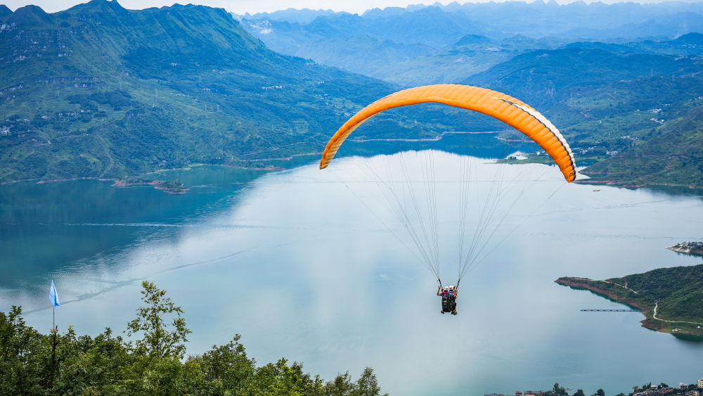 7月9日,游客在教练的陪同下体验低空滑翔飞行。滑翔伞这一低空旅游项目成为了贵州省六盘水市众多游客的新选择。新华社记者 陶亮 摄