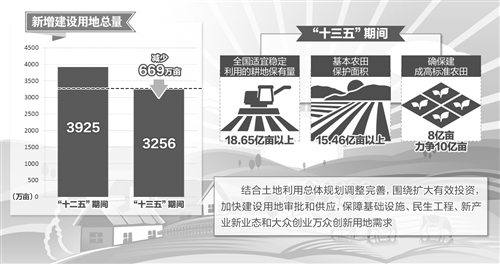 《国土资源“十三五”规划纲要》确定了土地、矿产、地质、海洋、测绘地信5领域18项主要指标,更加突出资源保护,体现资源利用节约集约,为经济社会发展提供资源保障,突出生态文明建设和民生。在节约集约用地要求下,面对“去库存”任务,“十三五”时期全国新增建设用地将比“十二五”减少约669万亩——