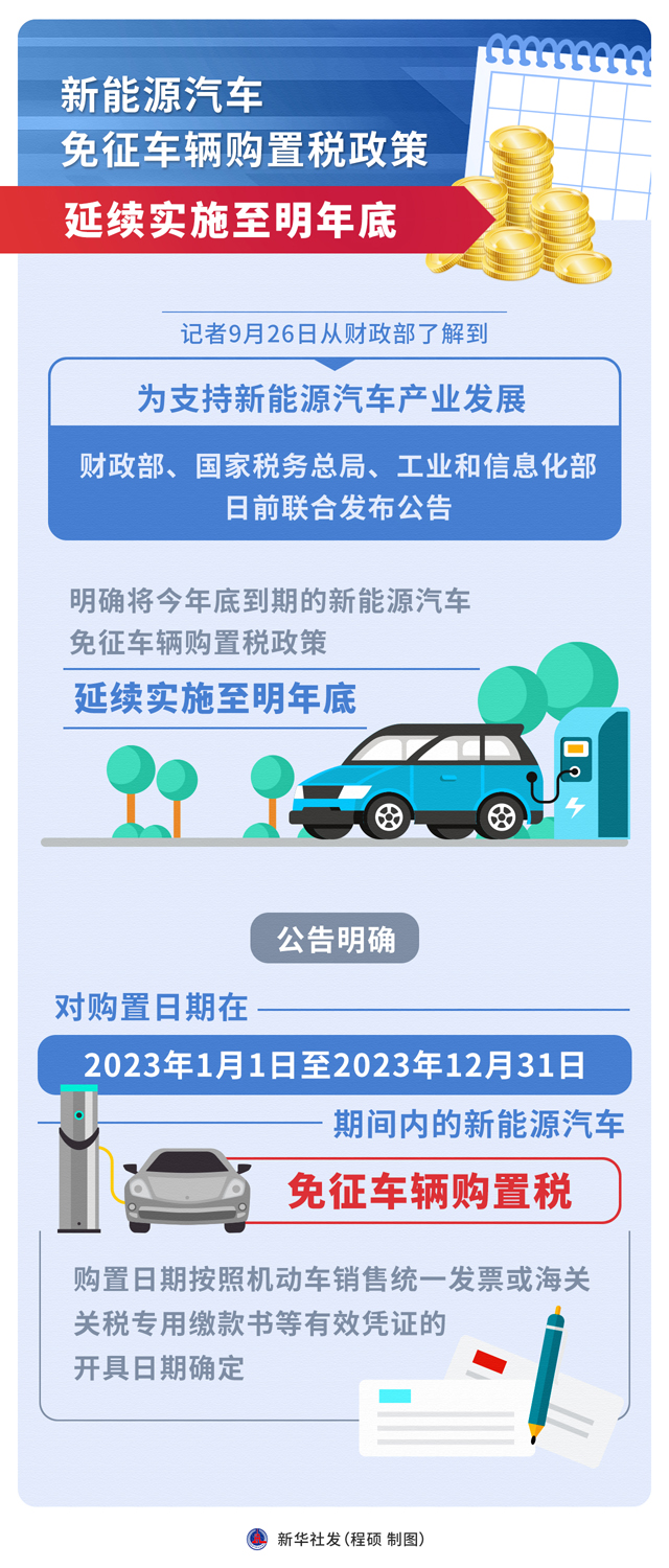 记者9月26日从财政部了解到,为支持新能源汽车产业发展,财政部、国家税务总局、工业和信息化部日前联合发布公告,明确将今年底到期的新能源汽车免征车辆购置税政策,延续实施至明年底。
