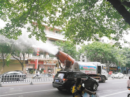 随着大家对城市环境卫生状况越来越重视,一些好用的环卫新设备逐渐流行,图为蓬江街头一辆抑尘作业车正在工作。 章工 摄